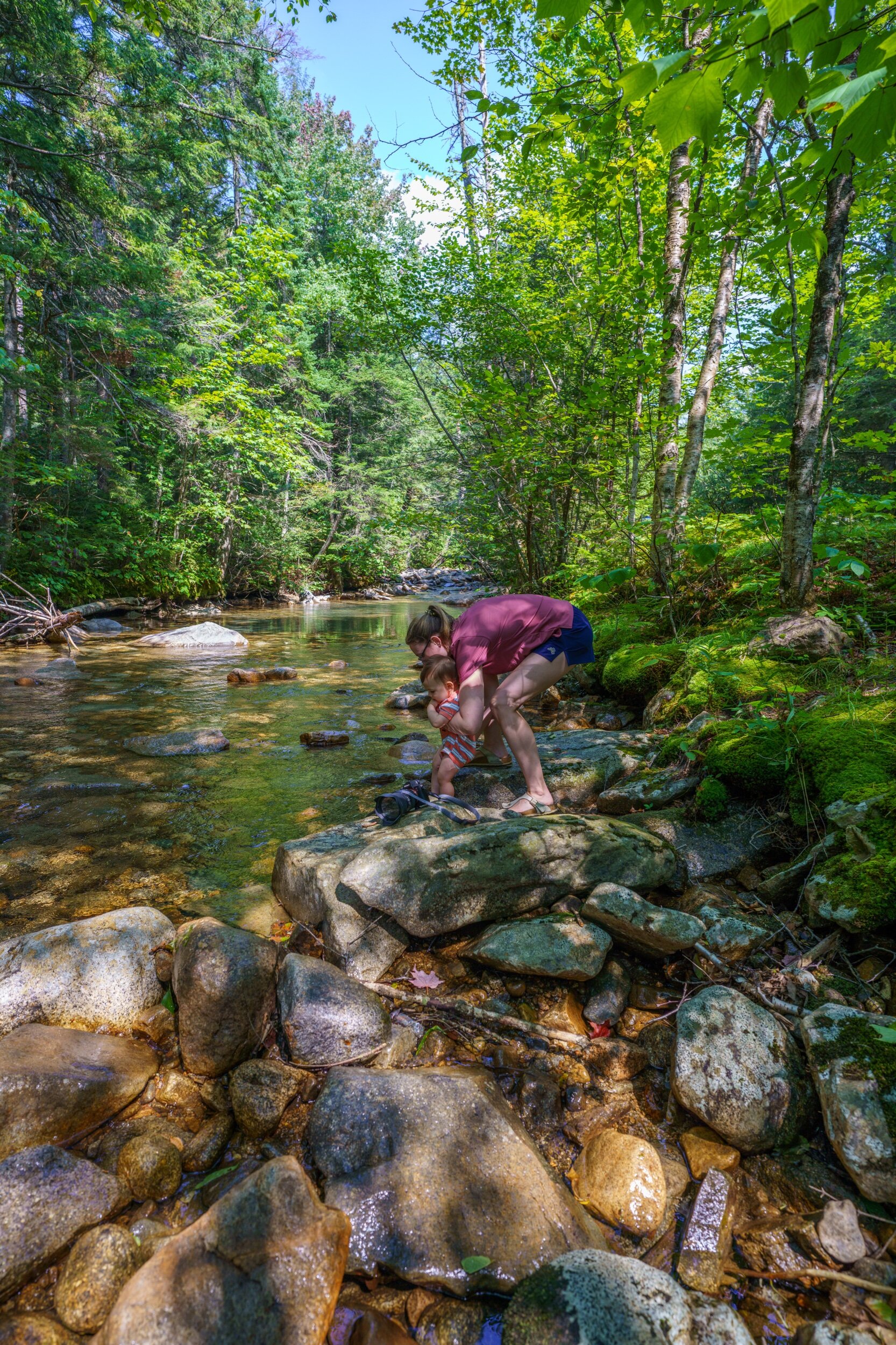 The second day of our trip, we thought we’d try to hike South Twin with River. However, by the time we reached the trailhead, temps had reached the mid-80s, and it was just too hot to hike with a baby. We decided to pack up camp, as temps were to continue into the night, and take the success of the previous night as a win. On our drive back, we stopped at The Basin and dipped our toes in the cool water. If you’ve never visited The Basin, it’s right off the highway in Franconia Notch State Park. It’s accessible to anyone- a short stroll on a paved trail to a lovely creek. It was quiet when we visited, probably due to the heat, which also contributed to our keeping our visit short.