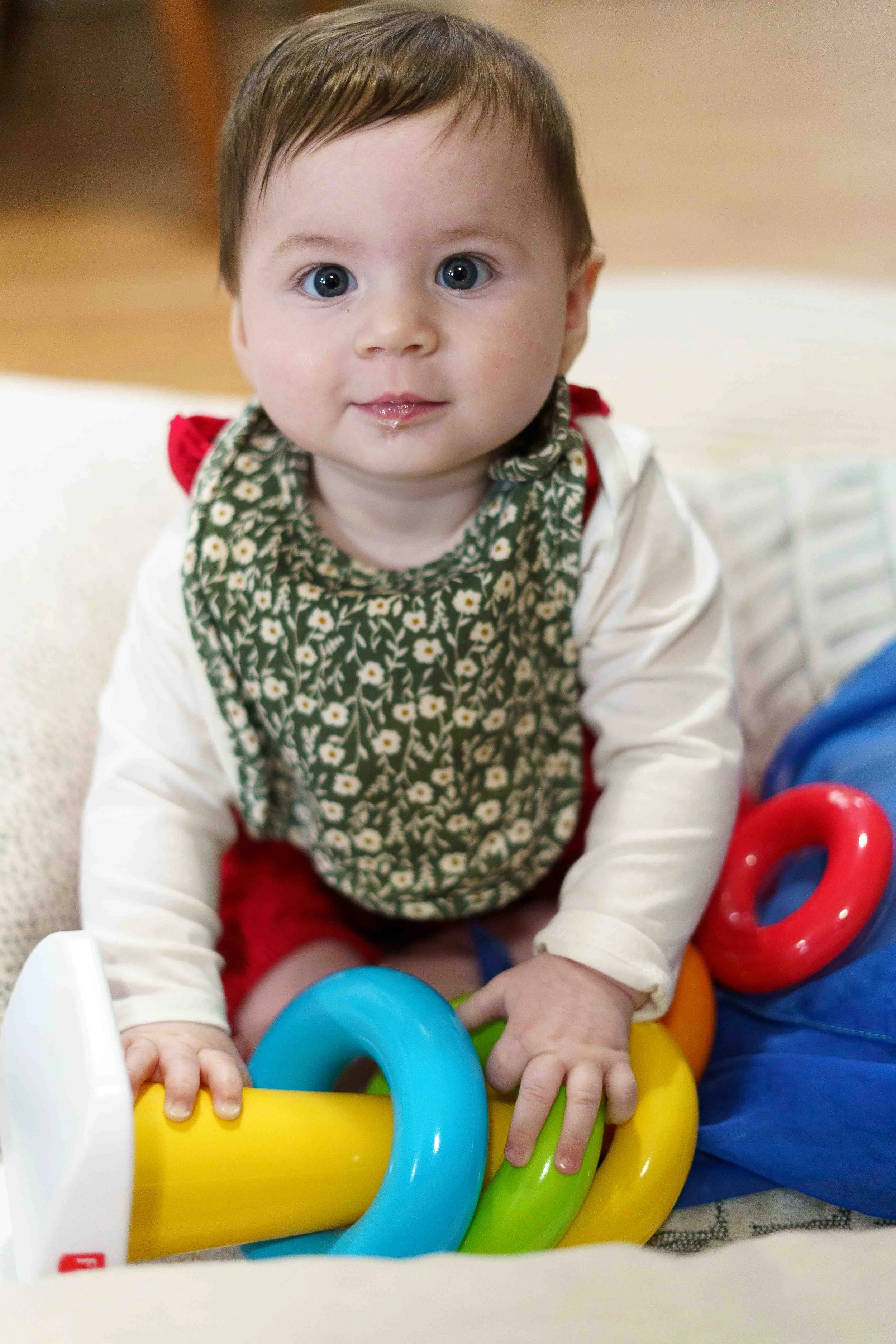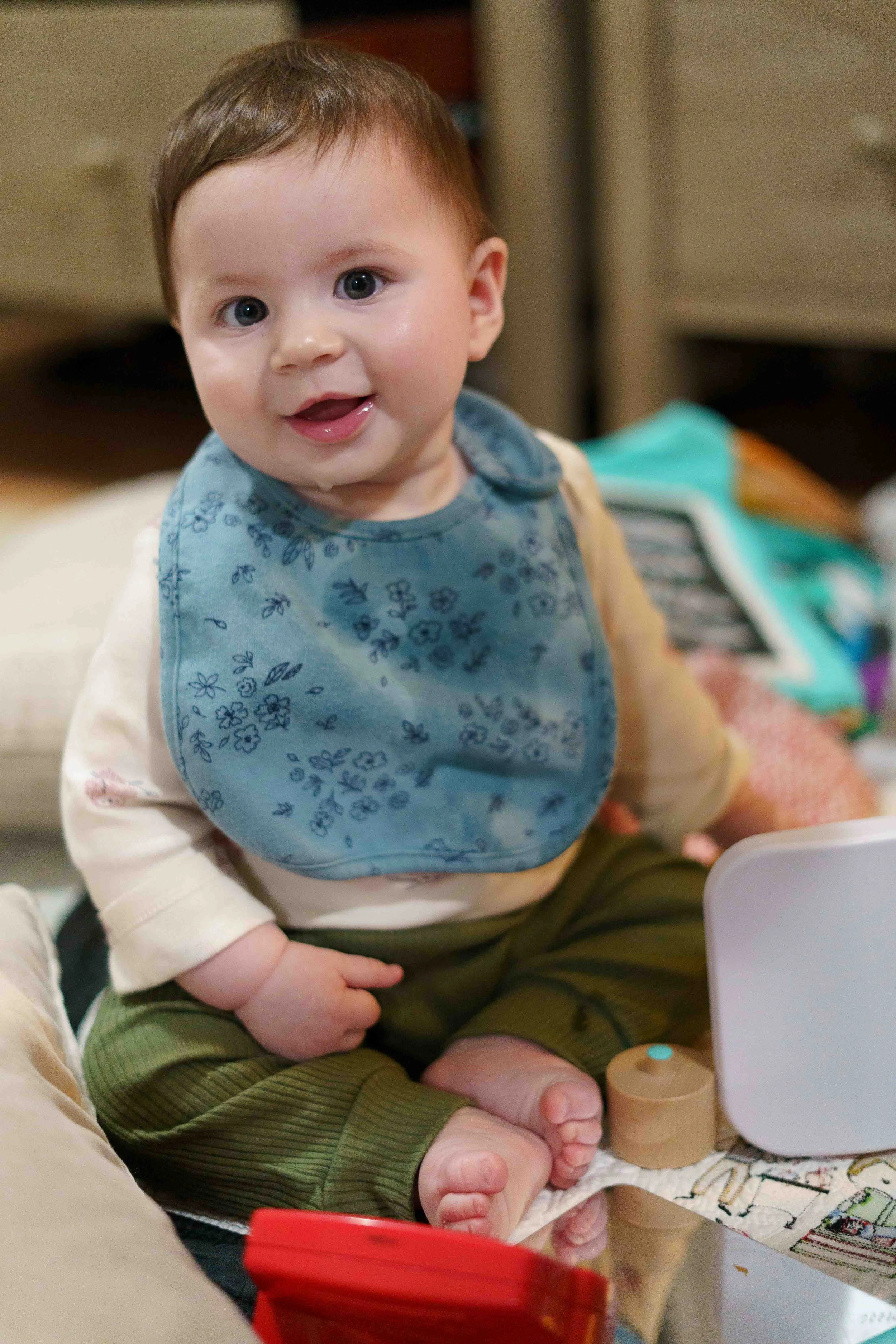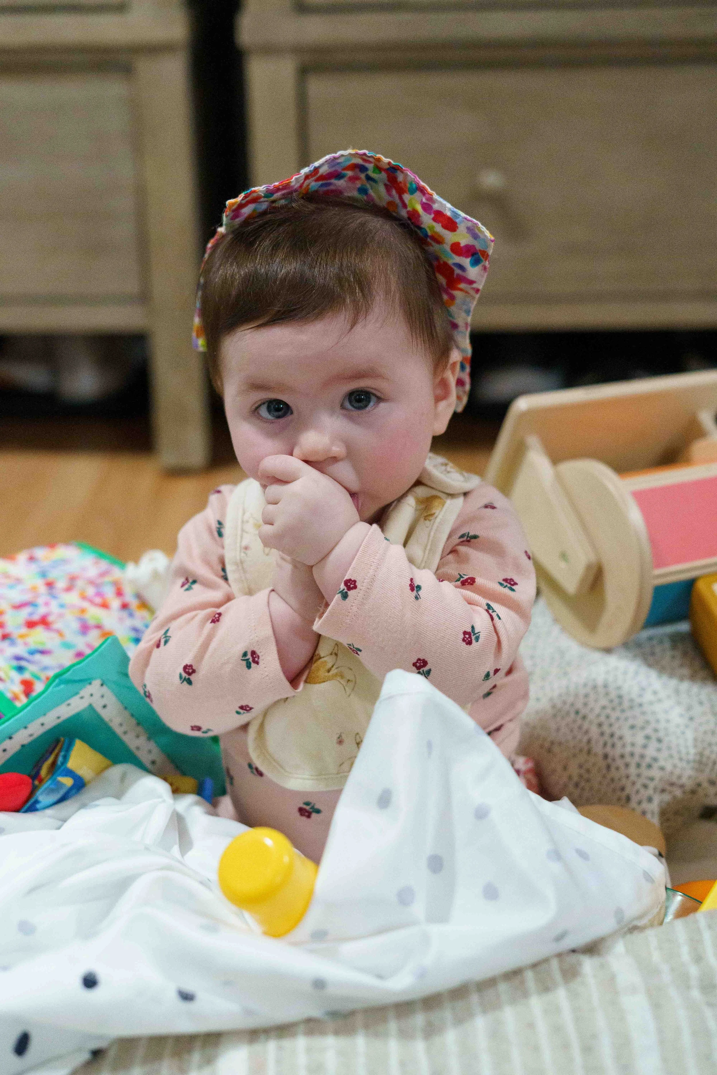 All this week, River, when he wakes up in the morning, when he finishes a meal, when he gets out of the bath, has announced, “Want to play with Ellesy!” Playing with Ellesy entails Eleanor sitting on a blanket on the floor while River surrounds her with all of his toys and all of her toys. Luckily, this is Eleanor’s favorite game, too.