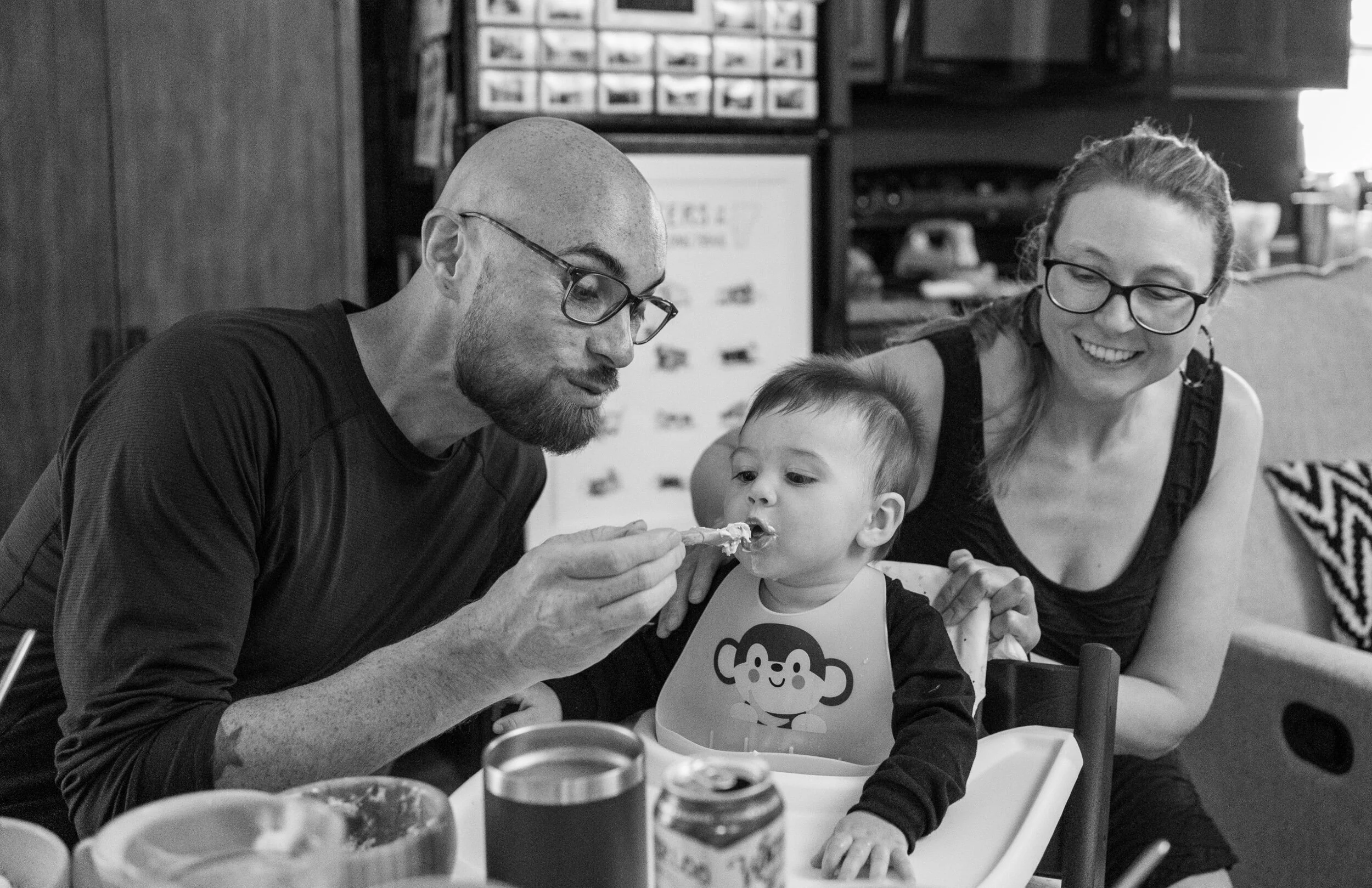 River started eating solid food last month. He was dubious at first, and a little unwieldy, but he’s gotten the hang of it. His favorites include banana, blueberry, and really all fruits. He has also tried many other foods, including chicken, sweet potato, and plain Greek yogurt. He hasn’t refused one yet.