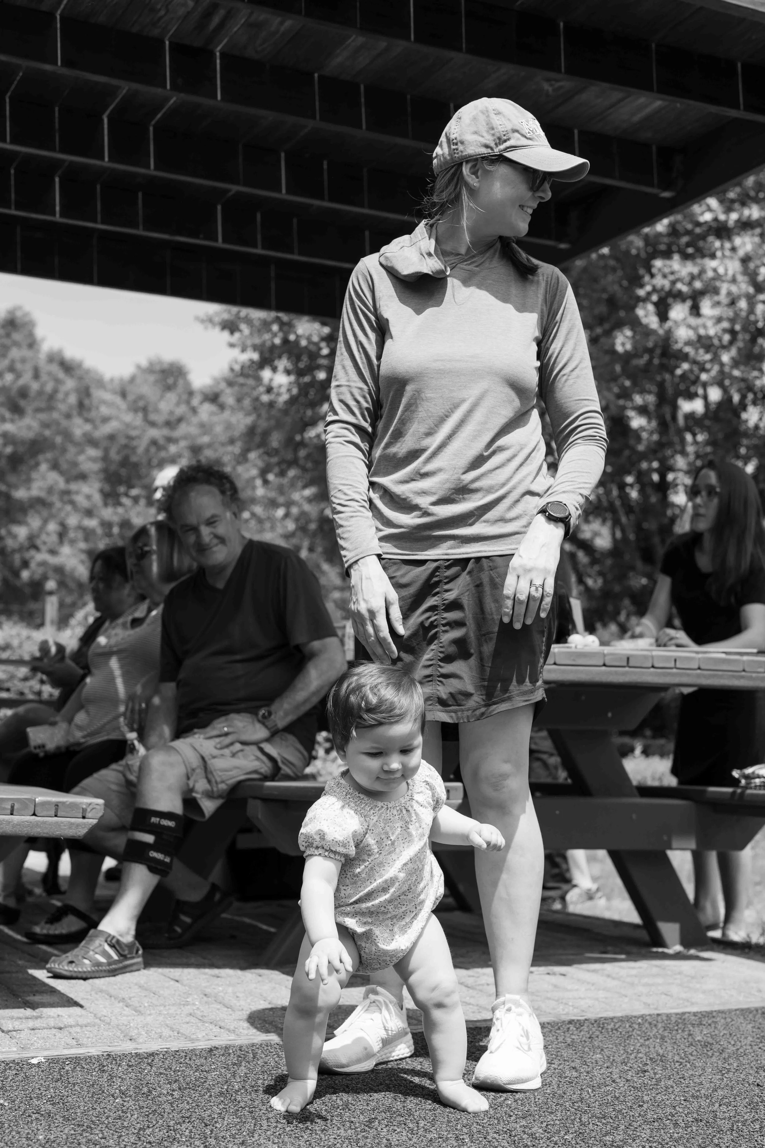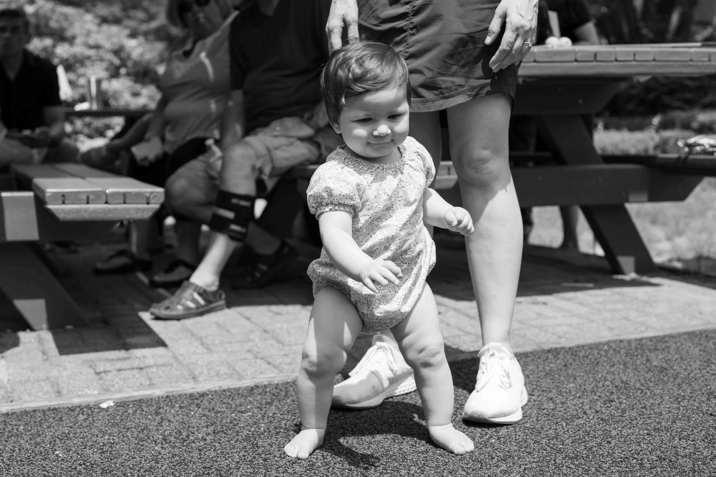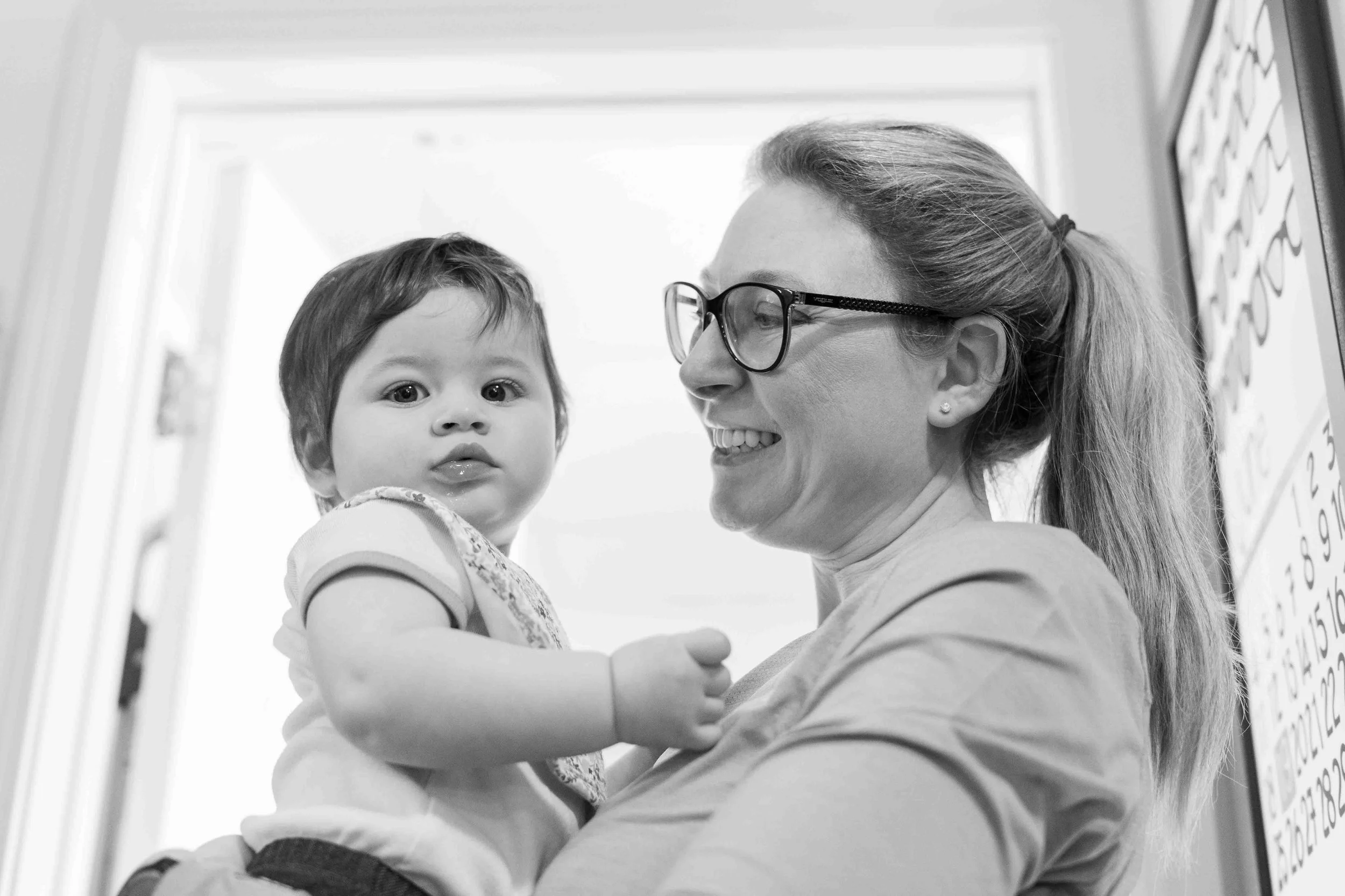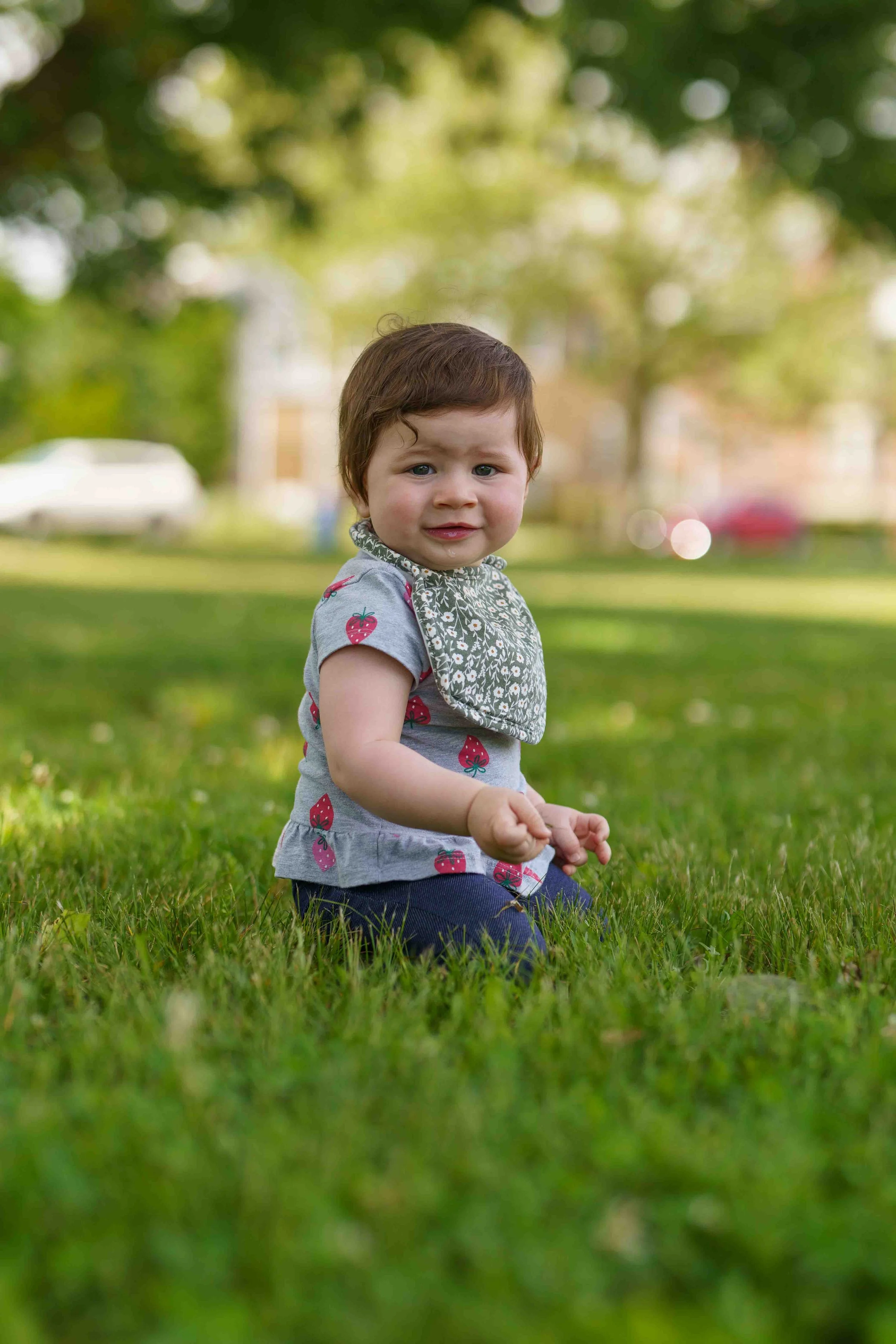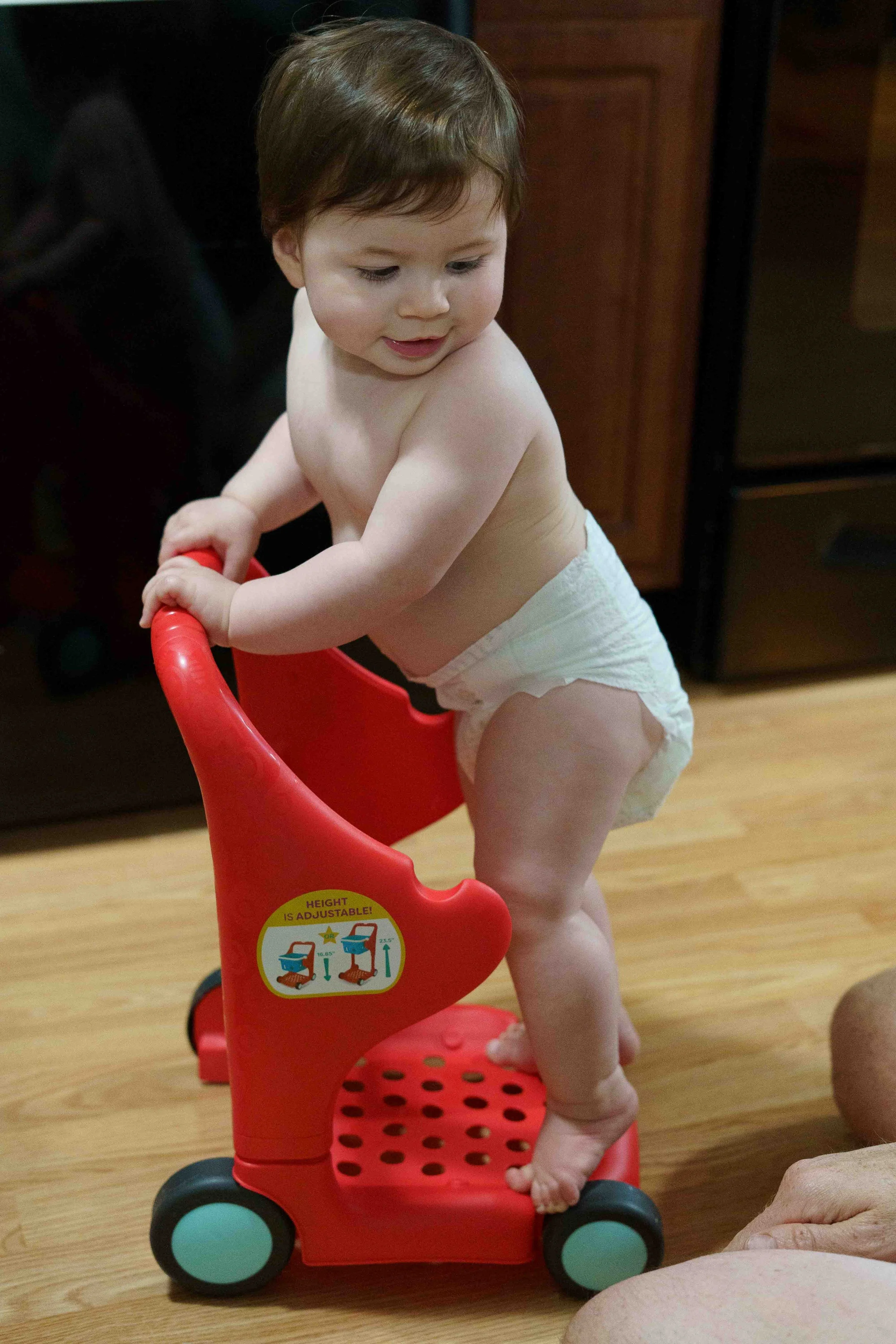 Eleanor is 11 months old! She likes to imitate- kissing faces, clapping, waving. She shakes her head no in a very dramatic and funny way,” saying “ahhhhhhhh” almost like she’s saying “nooooooooo.” She knows what I’m saying if I say, “Let’s go wake your brother!” And she loves to play “Where’s Elles? There she is!”